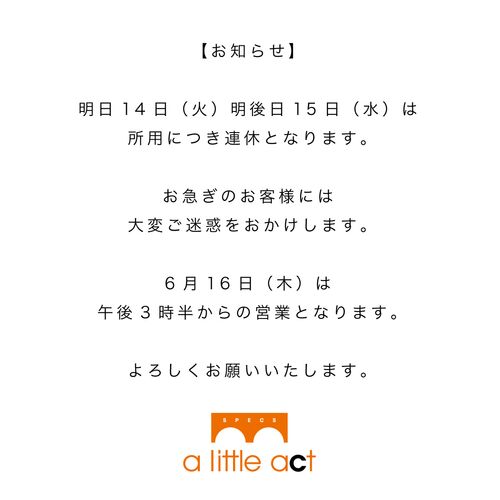 16日(木)は午後3時半からの営業です。 よろしくお願いいたします。