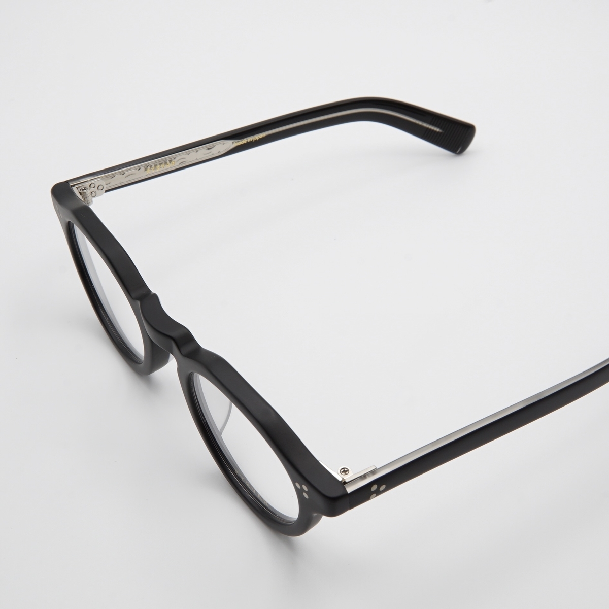 内側だけにツヤを残した「MPBK」。テンプルの内側はクリアの生地が合わせてあり、芯金に施された彫金柄が透けて見えます。透明感が美しい「SMK」は顔馴染みが良いカラーです。